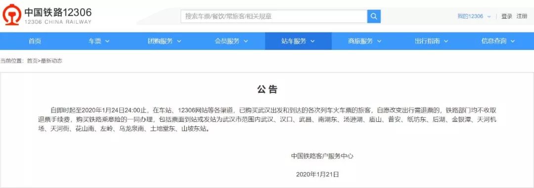 铁路部门也宣布,自1月21日起至2020年1月24日24:00止,在车站、12306网站等各渠道,已购买武汉出发和到达的各次列车火车票的旅客,自愿改变出行需退票的,铁路部门均不收取退票手续费,购买乘意险的一同办理。