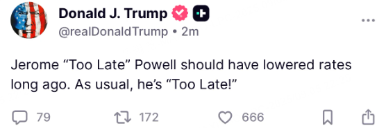 美国总统特朗普发文称,“太迟先生”鲍威尔早就应该降息了,像往常一样,他“为时已晚”!