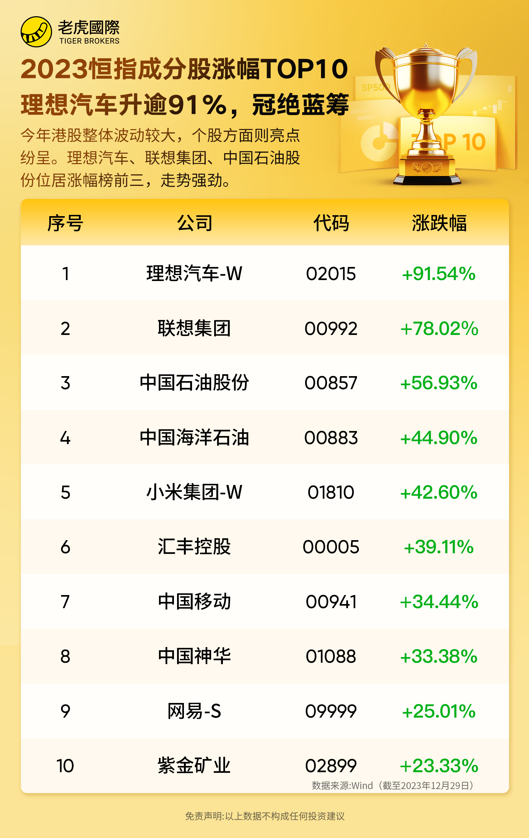 个股方面则亮点纷呈,在恒生指数成分股范围内,理想汽车、联想集团、中国石油股份位居涨幅榜前三,走势强劲。