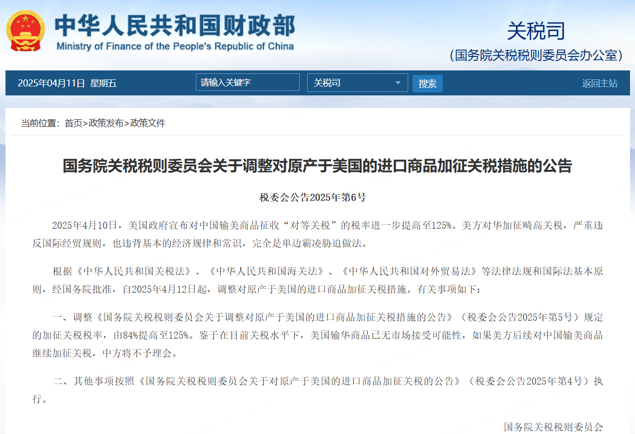一、调整《国务院关税税则委员会关于调整对原产于美国的进口商品加征关税措施的公告》(税委会公告2025年第5号)规定的加征关税税率,由84%提高至125%。鉴于在目前关税水平下,美国输华商品已无市场接受可能性,如果美方后续对中国输美商品继续加征关税,中方将不予理会。