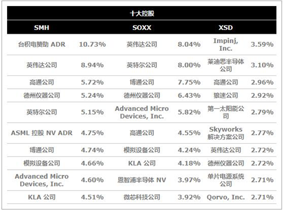 目前在美国市场上交易的半导体有 6只,除 1只涵盖美国上市证券外。只有三个管理着超过 10亿美元的资产,其中最大的是 70.7亿美元的VanEck半导体 ETF (SMH),它也恰好是唯一的全球基金。有趣的是,尽管作为全球基金的范围更广,SMH也是最集中的投资组合,只有 25家公司代表。该类别中的所有其他基金包括 30至 40只证券。事实上,SMH持有的23只股票也在规模略小 70.4亿美元的iShares Semiconductor ETF (SOXX)的投资组合中。
