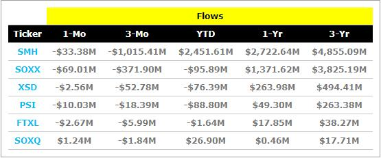 SOXX是该领域多年来最大的基金,截至 2021年底,拥有近 100亿美元的资产。然而,从 2022年开始,SMH保持领先,现在是该类别中唯一在 2022年出现强劲正资金流入的基金,截至 7月 21日,今年迄今已获得 25亿美元的资产。该类别中唯一一个在 2022年年初至今流入正数的基金是Invesco PHLX Semiconductor ETF (SOXQ),它追踪 SOXX的原始指数(SOXX在2021年 6月放弃了该指数)。SMH在该类别中的回报率最高,亏损近 25%,但所有其他基金在 2022年均下跌 26-28%。