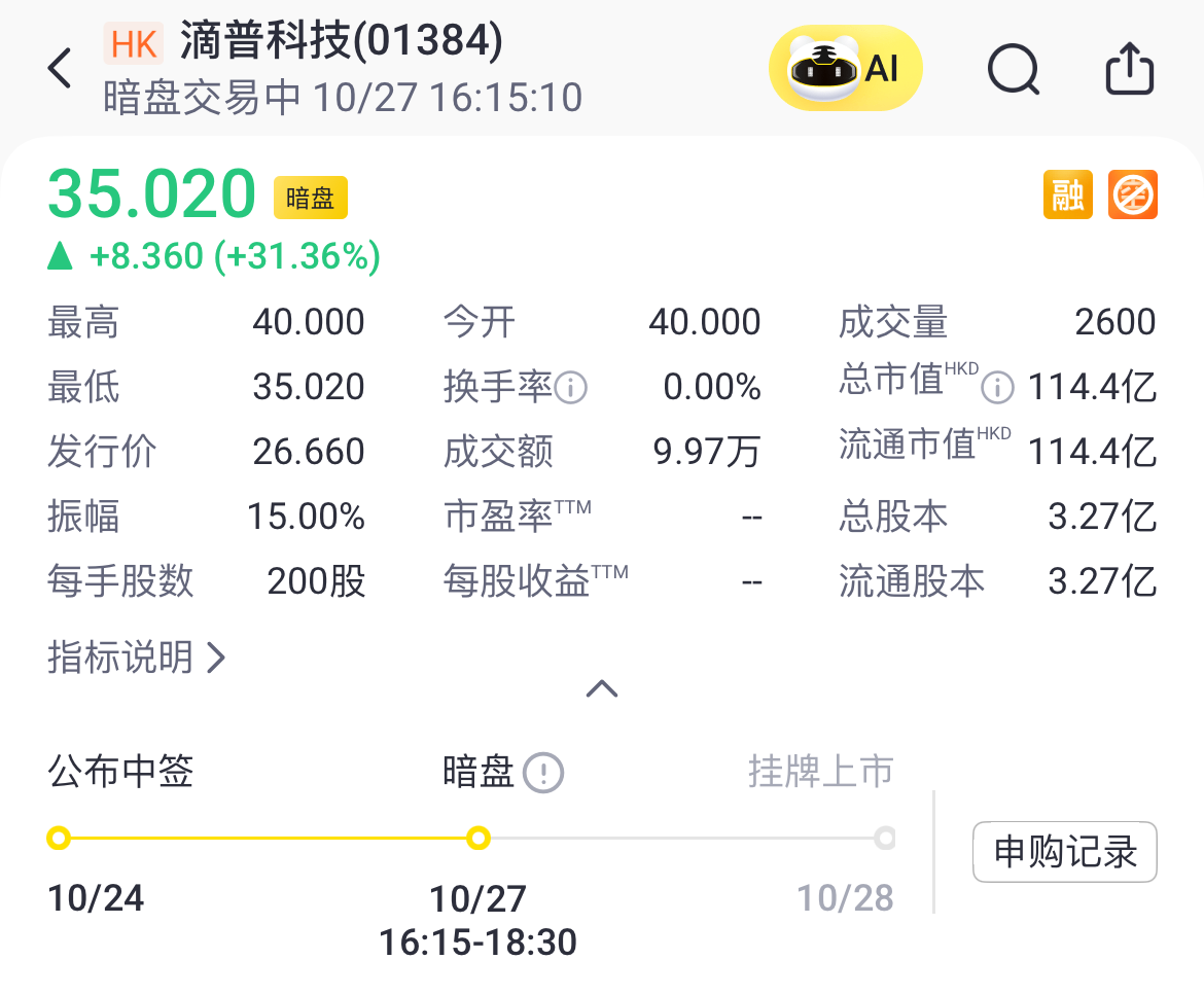 滴普科技暗盘高开逾30%,一手账面赚1672港元。