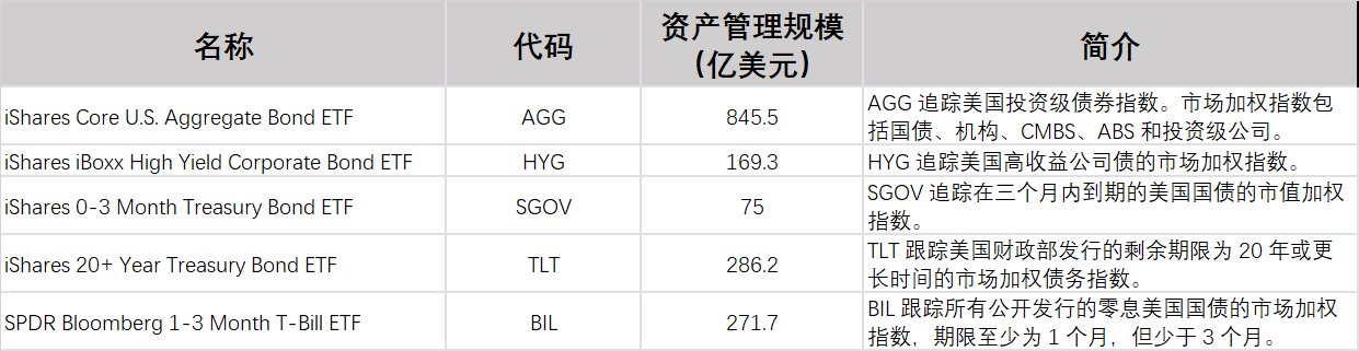 因此,iShares 核心美国综合债券 ETF(AGG)、iShares iBoxx 美元高收益公司债券 ETF(HYG)、iShares(EMDI)$ 0-3 个月国债 ETF(SGOV)、iShares 20 年以上国债 ETF(TLT) 和SPDR Bloomberg 1-3 个月 T-Bill ETF(BIL) 在上周的榜单中独领风骚。