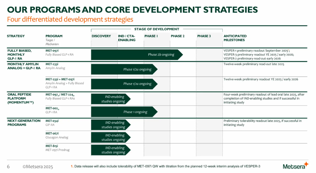 一是 MET-097i,一种每周和每月注射一次的 GLP-1 受体激动剂,均处于 Ⅱ 期开发阶段;