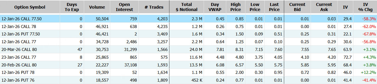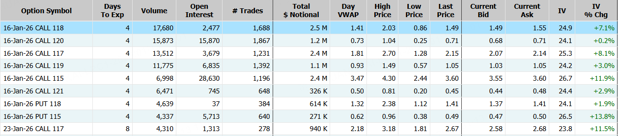 隔夜,沃尔玛上涨3%,期权合约成交19.24万张,较90日均量放大1.8倍。1月16日到期的118美元的行权看涨期权交易量特别高,共有17,680份合约交易。 $WMT 20260116 118.0 CALL$