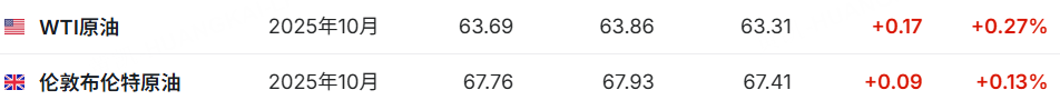 原油期货上涨,截止发稿,WTI原油涨0.27%,报63.69美元/桶;布伦特原油涨0.13%,报67.76美元/桶。