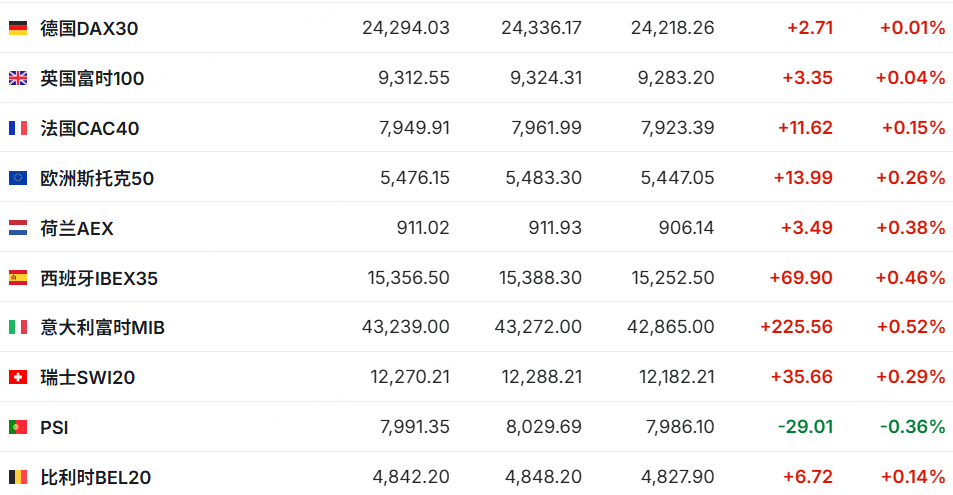 欧洲主要股指普遍上涨,德国DAX30涨0.01%,法国CAC40涨0.75%。