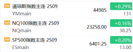 8月22日,美股三大股指期货上涨,截止发稿,道指期货涨0.29%,纳指期货涨0.16%,标普500指数期货涨0.20%。