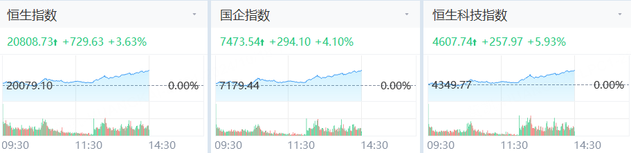 恒生指数涨超3%,恒生科技指数涨近6%。