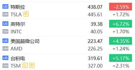 部分明星股夜盘上涨,台积电涨超2%,英特尔、AMD、特斯拉涨超1%。