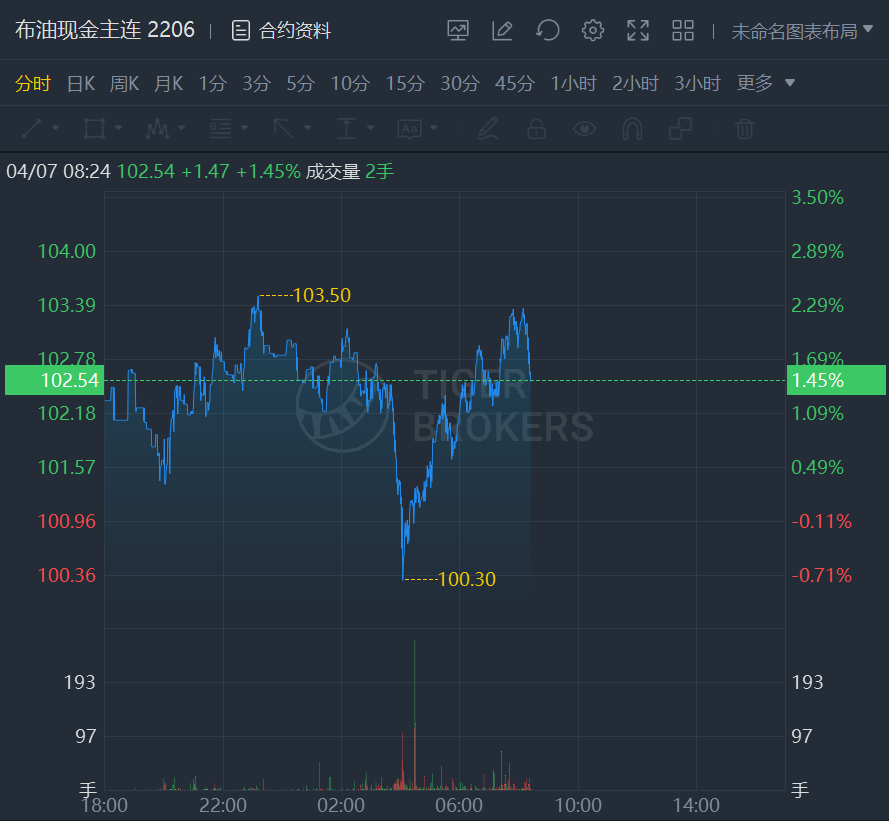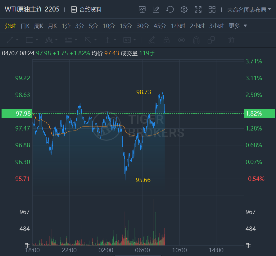 原油期货小幅上涨,截止发稿,WTI原油涨1.82%,报97.98美元/桶;布伦特原油涨1.45%,报102.54美元/桶。