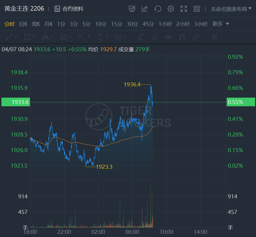黄金期货日内走高,截止发稿,涨0.55%,报1933.6美元/盎司。