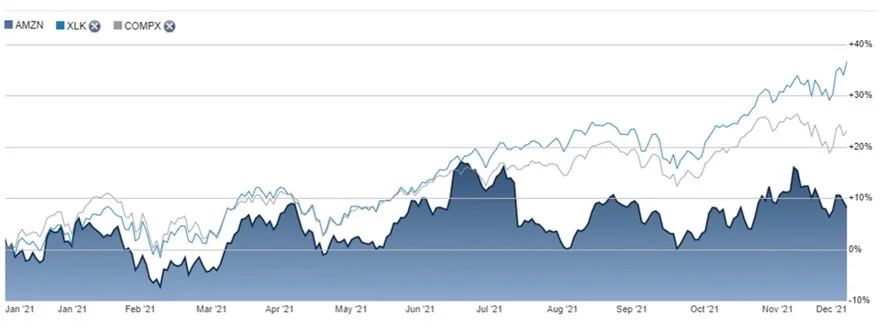 Amazon stock continues to be a disappointing underperformer in 2021. The chart below shows that shares have lagged the tech sector and the tech-rich Nasdaq index by a mile so far this year.