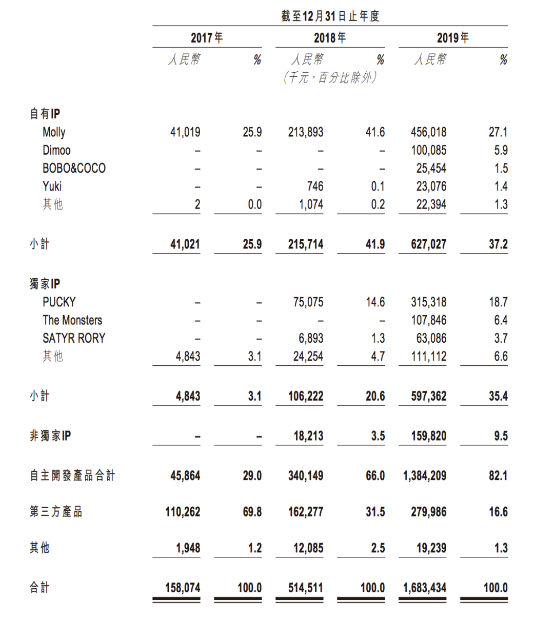 2016年,泡泡玛特开始与Molly的创作者王信明合作,并开始Molly的大规模商业化。2019年,基于Molly形象自主开发的潮流玩具产品产生的收入为4.56亿元,在2019年总收入的占比为27.1%;而前四大IP产生的收入均超过1亿元。