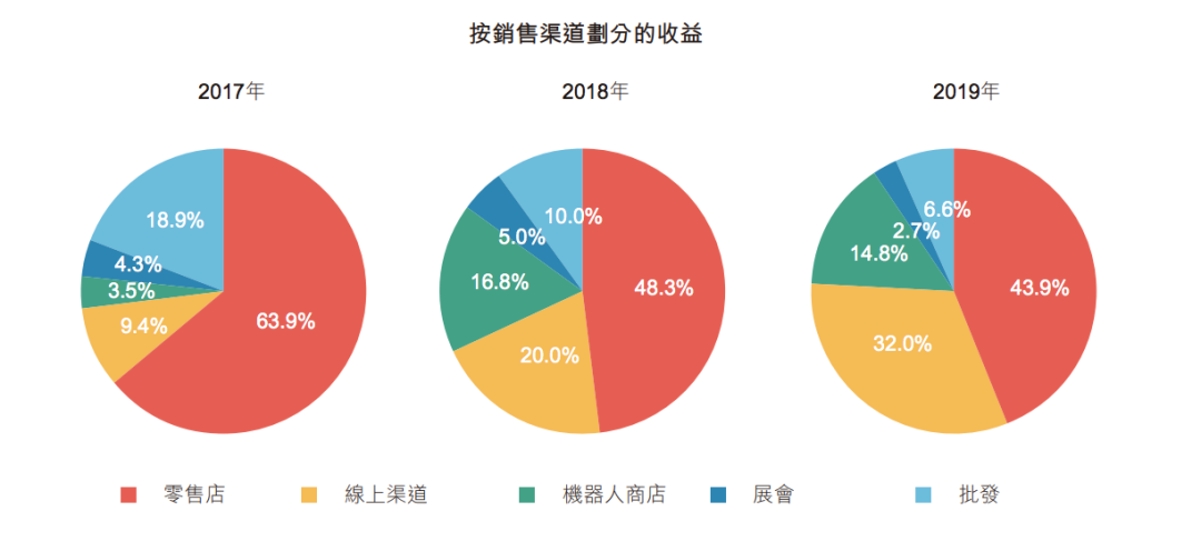 销售渠道方面。截至2019年12月31日,泡泡玛特的销售和经销网络主要分为5大类:其一是主要位于中国33个一二线城市主流商圈的114家零售店;其二是位于57个城市的825家创新机器人商店,其可提供交互式的有趣购物体验;其三则是天猫旗舰店、泡泡抽盒机、葩趣等线上渠道;其四是北京国际潮玩展和上海国际潮玩展;第五则是批发渠道,包括国内的22家经销商以及国外的19家经销商。