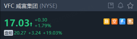 Vans、北面母公司威富集团大涨19%。第二财季扭亏为盈,收入略高于预期。