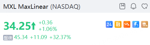芯片制造商MaxLinear股价盘后大涨32%,此前公司公布的第一季度业绩超出预期,并上调了业绩指引。经调整后,MaxLinear每股收益为0.22美元,营收为1.372亿美元。根据FactSet的数据,分析师此前预计该公司每股收益为0.18美元,营收为1.346亿美元。