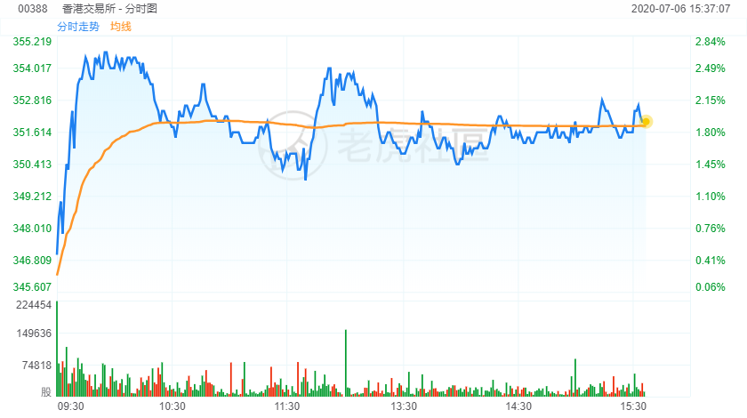 7月6日,港交所涨约2%,报352.4港元,盘中高见355港元再创历史新高,总市值4468亿港元。全球股市火爆,恒指涨幅突破1000点,现报26410点,创3月5日以来新高。大市目前成交额2189亿港元,已创2018年3月23日以来新高。
