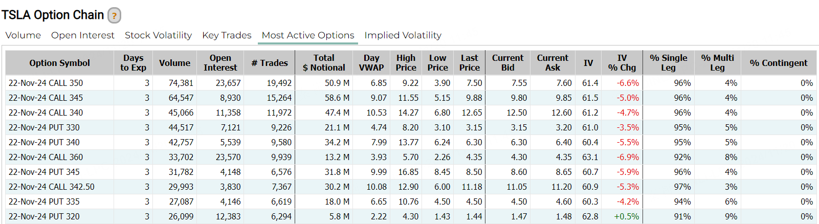 期权方面,特斯拉当日期权成交161.97万张合约,看涨期权占比为62.3%,其中于11月22日到期的350美元行使价的看涨期权成交居前,成交7.4万张。