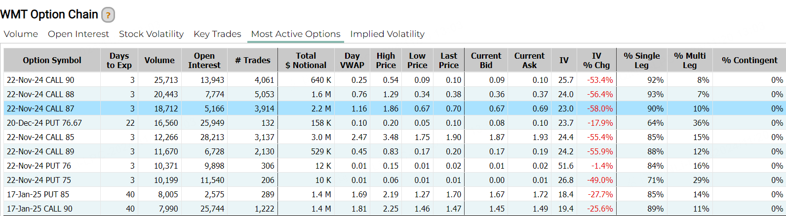 沃尔玛收高3.00%。消息面上,该公司第三财季营收和利润双双超预期。由于假日季开局稳健、以及追求性价比的美国消费者需求强劲,沃尔玛上调年度展望。期权方面,沃尔玛当日成交约41.8万张合约,看涨期权占比攀升至58%,其中于11月22到期的90美元行使价的看涨期权成交居前,成交逾2.5万张。
