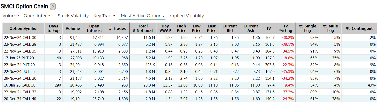 超微电脑收高31.24%。周一和周二两个交易日,该股累计上涨超过50%。消息面上,公司聘请了新的独立审计师BDO USA,P.C.(BDO),并向纳斯达克交易所提交了合规计划,立即生效。BDO USA是全球五大会计师事务所网络之一——BDO国际(BDO International)的成员所。期权方面,超微电脑当日成交约140万张合约,较前一日增65%,看涨期权占比攀升至62.4%,其中于11月22到期的30美元行使价的看涨期权成交居前,成交逾9.1万张。