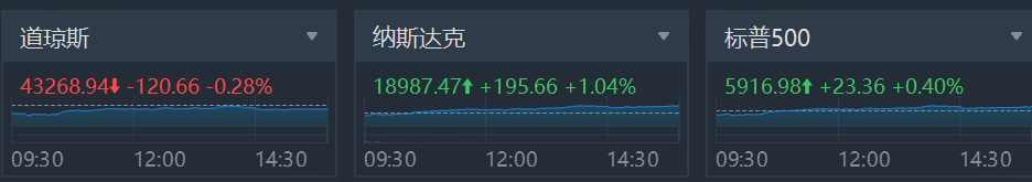 周二(11月19日)美股三大指数仅道指跌。标普500指数收涨23.36点,涨幅0.40%,报5916.98点。道指收跌120.66点,跌幅0.28%,报43268.94点。纳指收涨195.66点,涨幅1.04%,报18987.47点。
