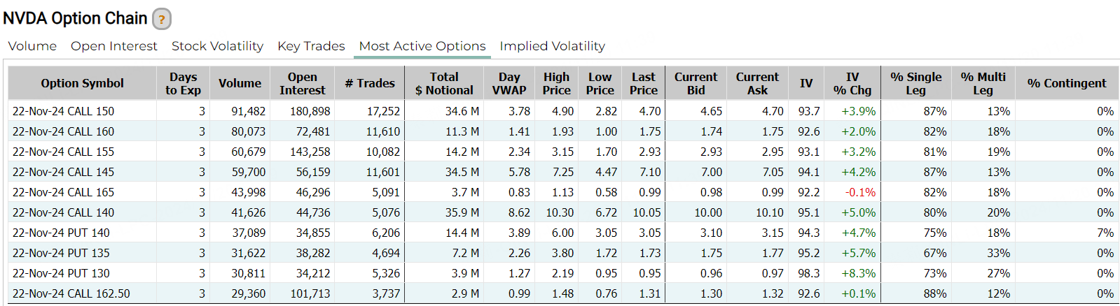 期权方面,英伟达当日期权成交257.75万张合约,看涨期权占比为61.3%,其中于11月22日到期的150美元行使价的看涨期权成交居前,成交9.1万张。