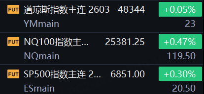 12月19日,美股三大股指期货齐涨,截止发稿,道指期货涨0.05%,纳指期货涨0.47%,标普500指数期货涨0.3%。