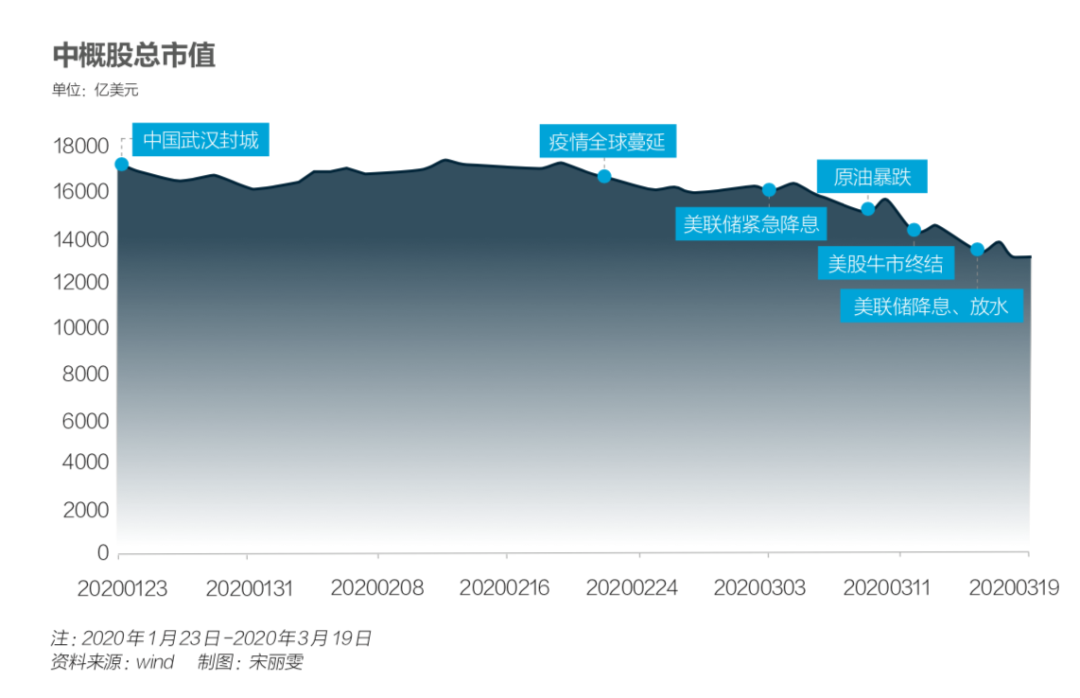 统计期间,在美上市中概股总体市值缩水23.49%(即跌去4084.47亿美元),同期道指跌超30%。其中:1月23日至2月21日,中概股总体市值下跌3%;2月24日至3月19日,美股进入下跌行情,中概股总体市值随之继续下跌。