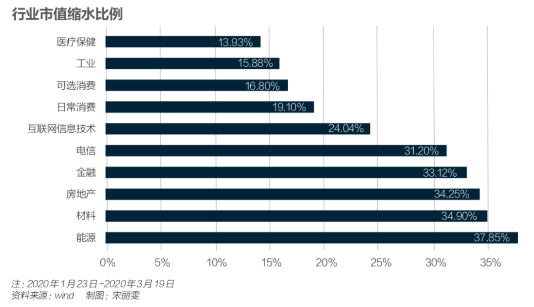 能源及材料等行业,受到供应链上下游影响,市值下跌最为严重,分别为37.9%与34.9%。