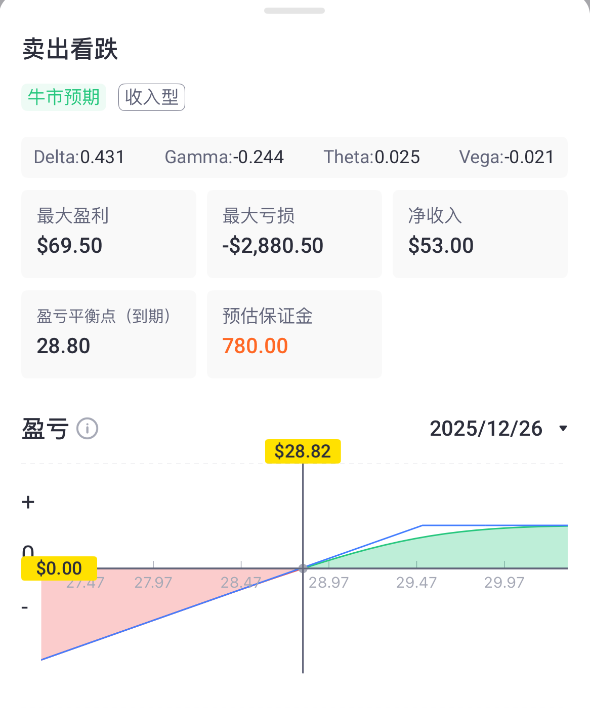 合约构建:卖出一张2025年12月26日到期、行权价为29.5美元WBD看跌期权。