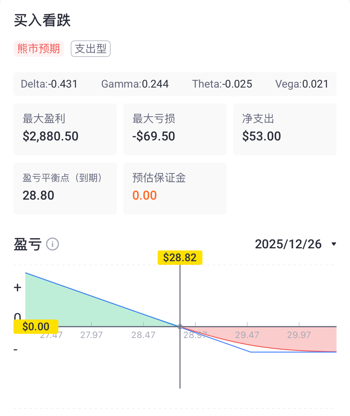 合约构建:买入一张2025年12月26日到期、行权价为29.5美元WBD看跌期权。
