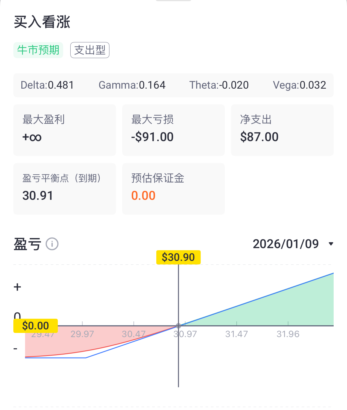 合约构建:买入一张2026年1月9日到期、行权价为30美元WBD看涨期权。
