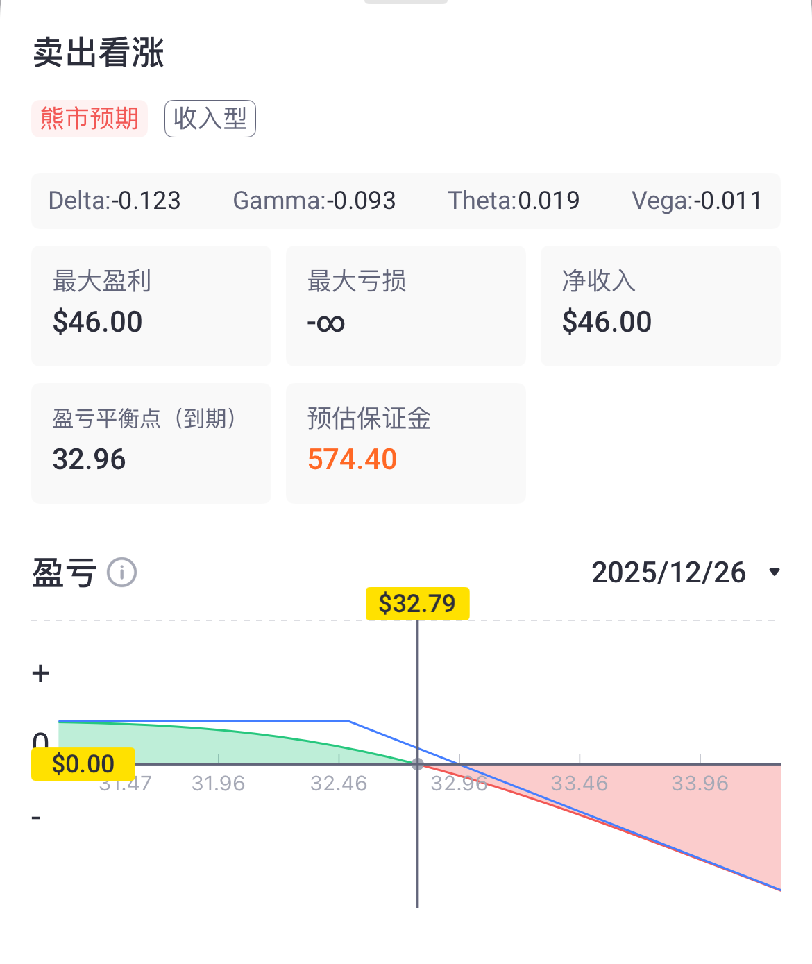 合约构建:卖出一张2025年12月26日到期、行权价为32.5美元WBD看涨期权。