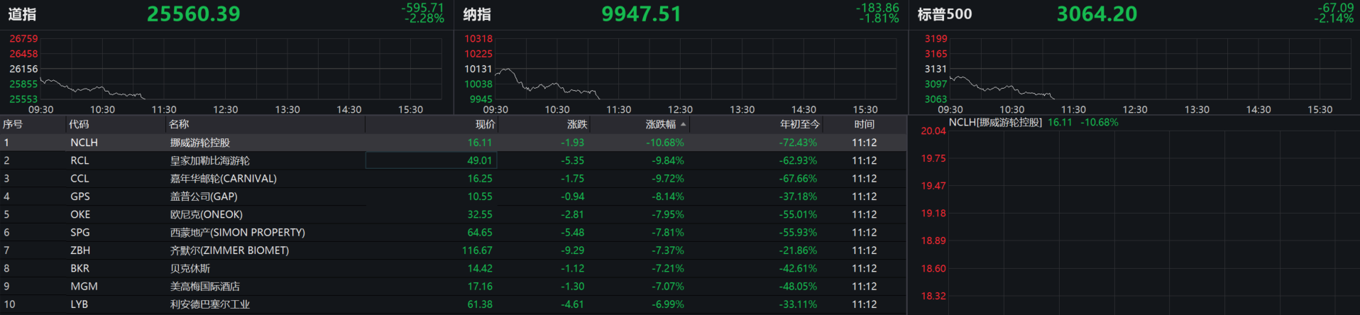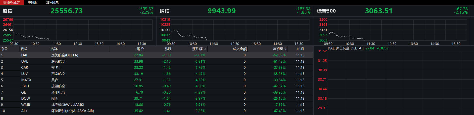6月24日开盘,美股跌幅扩大,三大指数均跌超2%。道指成分股中,航空股领跌。