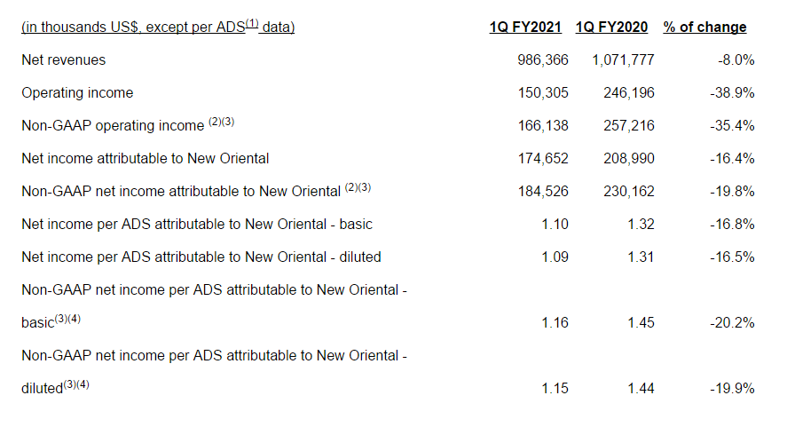 10月13日美股盘前,新东方发布截止2020年8月31日的2021财年第一财季财报。财报显示,公司第一财季净营收9.864亿美元,去年同期10.72亿美元,同比下降8.0%;第一财季净利润1.747亿美元,去年同期2.09亿美元,同比下降16.4%;2021财年第一财季摊薄每股盈利1.09美元,去年同期1.31美元,同比下降16.5%。