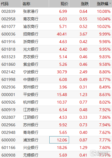 除了券商股之外,银行、保险板块也是强势尽显。银行股午后持续走强,渝农商行、招商银行、浙商银行、光大银行等相继封板,张家港行、苏农银行等大幅跟涨,招商银行创下历史新高,市值破万亿。