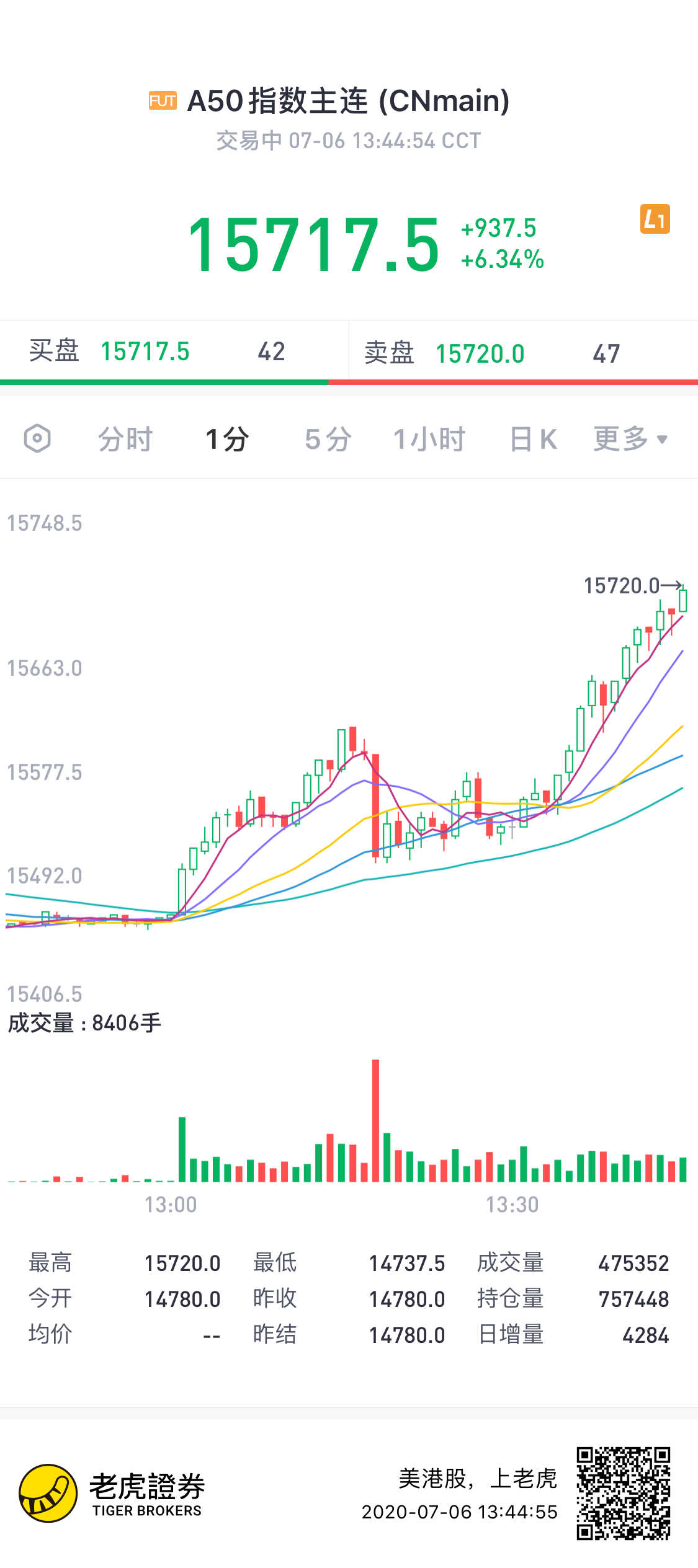7月6日讯,富时中国A50指数期货持续拉高,现涨6%,报15717.5点。券商板块逼近涨停,保险、免税概念、氮化镓、银行、多元金融等板块涨幅靠前。A股成交额连续第三个交易日突破1万亿元。