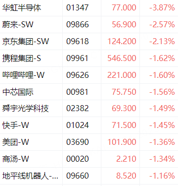 盘面上,大型科技股全线下跌,其中,京东跌超2%,美团、腾讯、小米皆下跌;半导体股、苹果概念股、生物医药股,以及昨日领衔上涨的有色金属股齐跌。