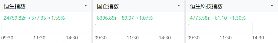 3月24日,港股三大指数高开,恒指涨1.55%,国指涨1.07%,恒生科技指数涨1.3%。