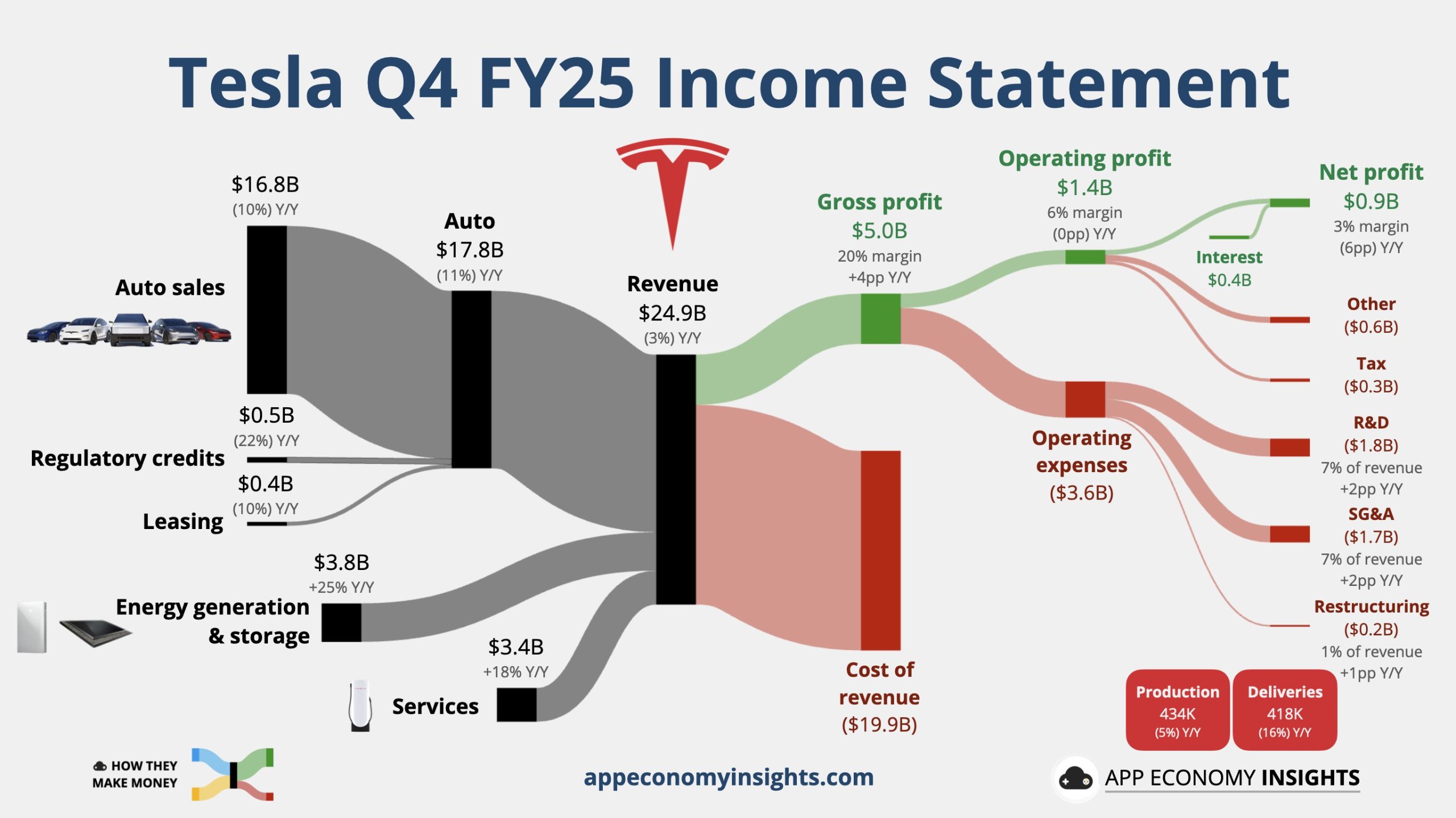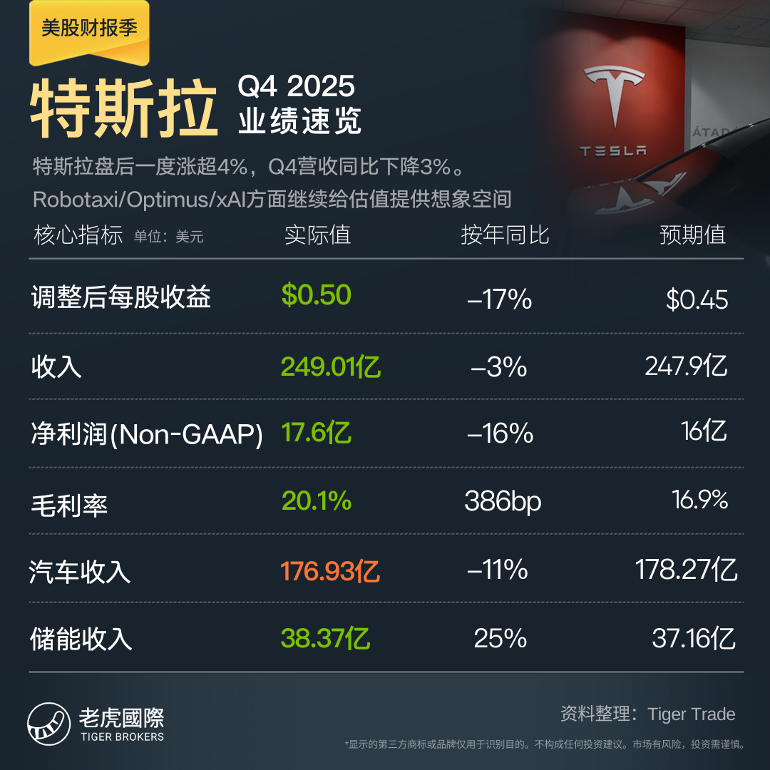 Q4特斯拉营收同比由增转降3%、略低于预期、首次年度营收下滑,当季EPS盈利降17%仍强于预期,毛利率升破20%,储能部署增29%至新高14.2GWh;1月开始在奥斯汀限量提供无安全监督员的Robotaxi;Cybercab、Semi卡车、储能系统Megapack 3均按计划今年开始量产;Optimus第一代生产线正铺设,目标今年底开始量产;预计Q1完成20亿美元认购xAI股票。股价盘后一度涨超4%。高管称今年资本支出超200亿美元,股价曾回吐多数涨幅。