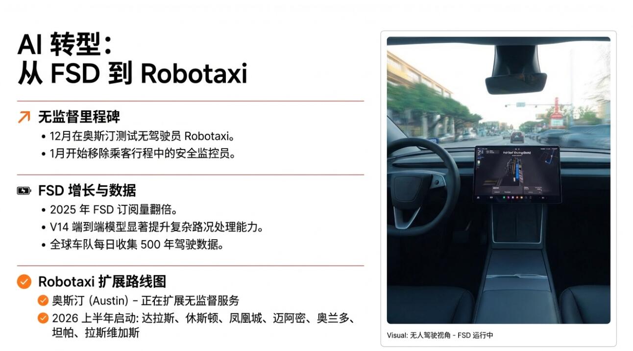 Robotaxi iOS 应用在公司服务区域“不再有候补名单”(no waitlist),且公司已列出,计划2026年上半年将服务覆盖到美国多个城市,包括:得州的达拉斯和休斯顿、亚利桑那州的凤凰城、佛罗里达州的迈阿密、奥兰多和Tampa、内华达州的拉斯维加斯。公司把“无监督 Robotaxi 放入商业运营”也计入了 CEO 绩效奖的交付指标口径。