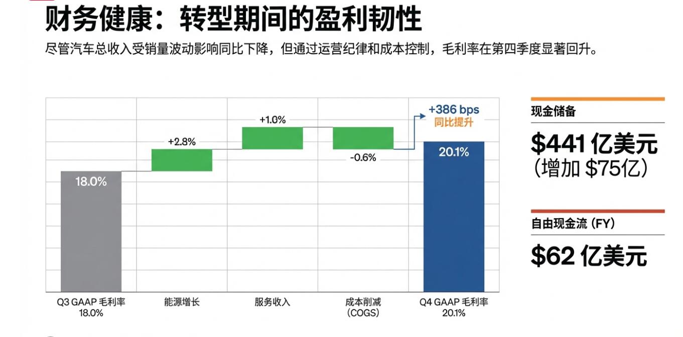 特斯拉四季度GAAP口径下总毛利同比增长20%至50.09亿美元,毛利率由三季度的18%升至20.1%,同比提高386个基点;当季营业利润同比下降11%至14.09亿美元,降幅远低于三季度的40%,营业利润率5.7%。特斯拉指出研发(R&D)与 AI 项目投入、SBC(股权激励)等支出抬升营业费用。
