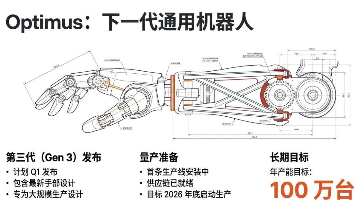 机器人方面,特斯拉称,Optimus 在 2025 年继续重大升级,包括最新手部设计,第三代Optimus Gen-3 为首个“面向规模化量产”的设计;公司已开始为首条生产线做供应链与产线准备,目标“在2026年底前启动量产线”,长期产能目标为最终达到一年100万台。