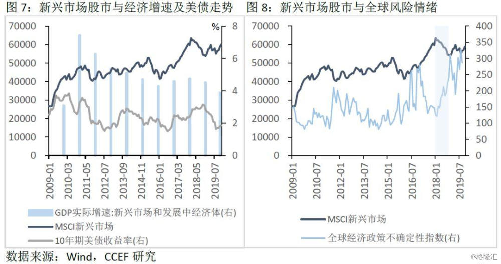 新兴经济体的股市同样取决于其经济基本面、无风险利率以及风险溢价。2016及2017年新兴市场整体复苏,带动MSCI新兴市场指数当年分别上涨6.6%、25.9%。2018年以来,全球贸易摩擦的升级和英国脱欧等问题导致全球经济政策不确定性指数快速攀升,投资者对未来的信心不足,加上GDP增速放缓,是导致新兴市场股市下跌的主要原因。2019年新兴市场股市行情变化和中美贸易前景的不确定性密切相关。
