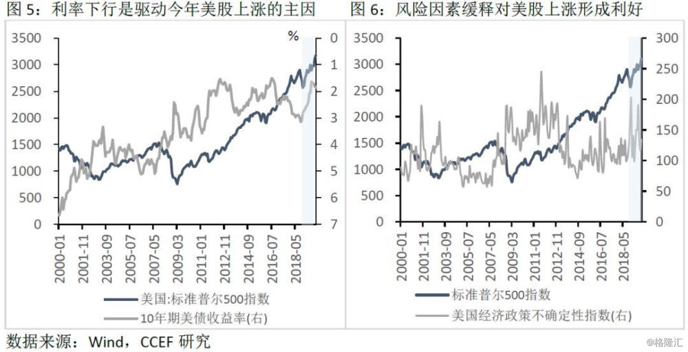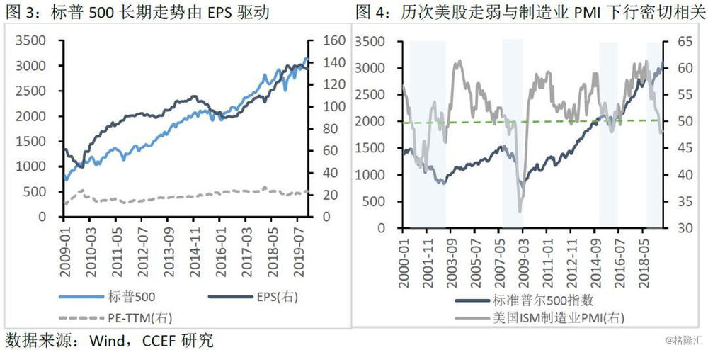 从中长期来看,美股估值相对稳定,股价变动主要由盈利水平所驱动。从历史数据来看,经济放缓、企业盈利水平下行通常会给股票价格带来下行风险。但2019年美股在企业盈利走弱以及制造业PMI持续走低跌破荣枯线的情况下,反而出现大幅上涨,主要受短期内无风险利率下行及风险溢价走低的影响(历史数据显示,10年期美债收益率的走低并不完全对应于美股上涨,主要由于降息操作反映对未来经济的悲观预期,企业盈利在该时期往往表现不佳。而本轮美联储实施的是“预防式”降息,在经济温和增长的情况下表现为无风险利率的快速下行),同时,流动性宽裕是估值上行的重要因素之一。此外,由于年初以来中美贸易摩擦风险有所缓释投资者风险偏好的上升压力,这些都是2019年美股上涨的推动因素。