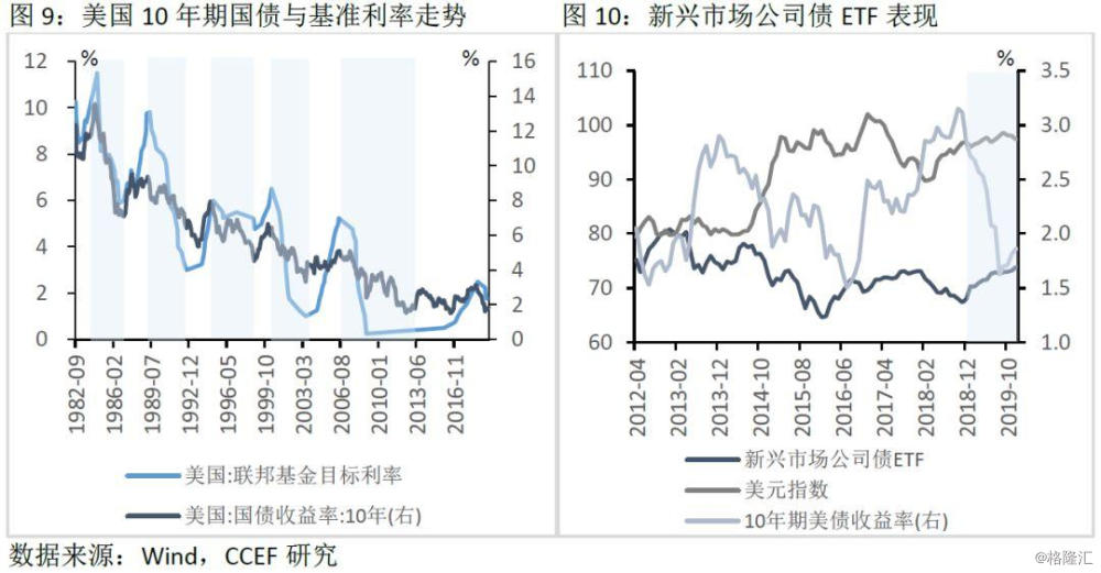 从历史数据来看,美国10年期国债收益率的走势与降息的节奏基本一致,但会有领先效应。目前市场已经消化美国降息三次的效果,10年期美债收益率自9月份之后开始小幅回升,缓解了此前收益率曲线倒挂的情况。美联储12月的FOMC会议声明称,未来一段时间内美联储将维持当前的利率水平,加息需要通胀持续高于2%以上。2020年,美国经济增速存在进一步放缓的风险,通胀中枢有望上行,美债的长期收益率可能会在历史低位呈现出震荡上行的格局。