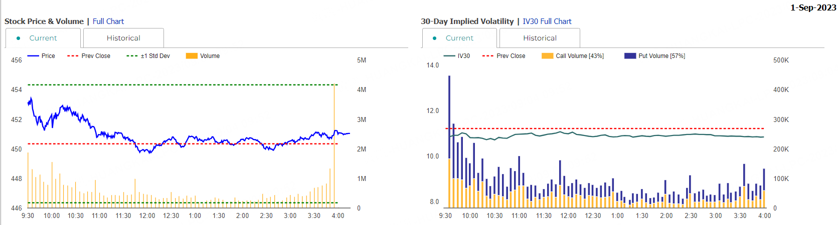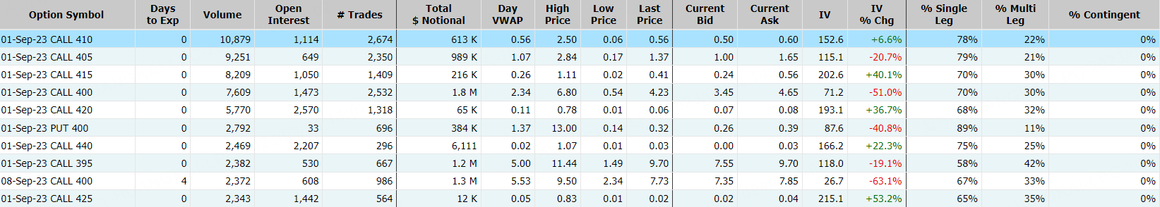Lululemon上周五涨超6%,期权合约成交15.1万张,较90日平均成交量扩大超7倍。9月1日到期的410美元的行权看涨期权交易量特别高,共有10,879份合约交易。