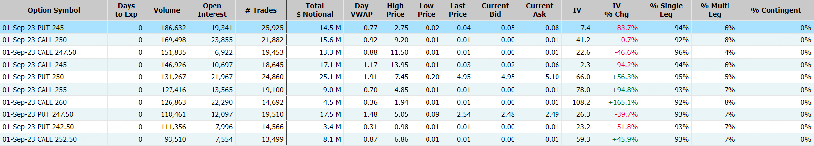 新款Model 3的价格高于分析师预期,特斯拉股价下跌5%,期权合约成交344.5万张。9月1日到期的245美元的行权看跌期权交易量特别高,共有186,632份合约交易。